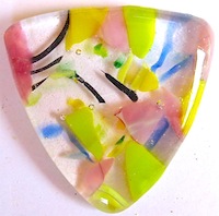 A cast glass pendant made from small opaque and transparent fusing glass pieces.
